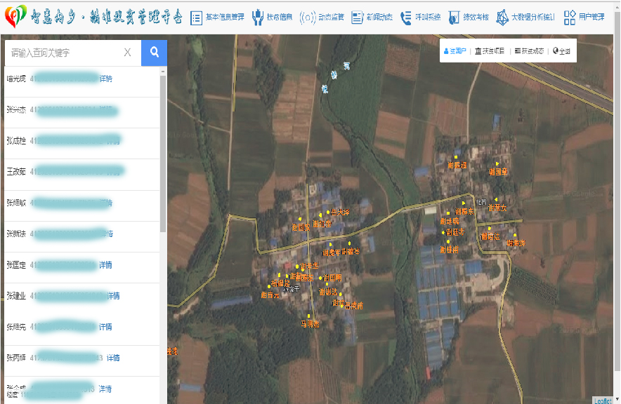 基础信息地图可视化:基于电子地图叠加显示全县贫困户信息,不同的图符和颜色代表贫困户、脱贫户和预脱贫等信息,通过地图可直观了解全县贫困户分布情况;单击地图上的贫困户可查询贫困户的各种信息,如家庭成员、贫困原因、帮扶责任人等信息实现扶贫信息“一张图”监管。